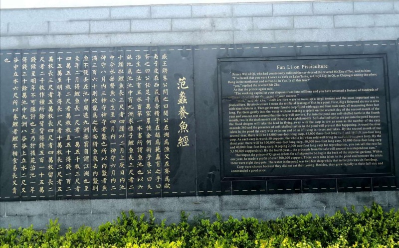 范蠡《养鱼经》是世界上最早的养鱼专著。越国大夫范蠡在公元前475年,写出了世界上第一部养鱼专著《养鱼经》。目前仍然是世界水产养殖的教科书。