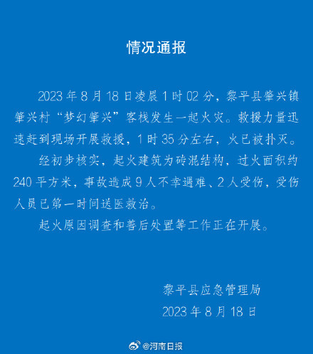 据贵州黎平县应急管理局消息:2023年8月18日凌晨1时02分,黎平县肇兴镇肇兴村“梦幻肇兴”客栈发生一起火灾。救援力量迅速赶到现场开展救援,1时35分左右,火已被扑灭。经初步核实,起火建筑为砖混结构,过火面积约240平方米,事故造成9人不幸遇难、2人受伤,受伤人员已第一时间送医救治。起火原因调查和善后处置等工作正在开展。