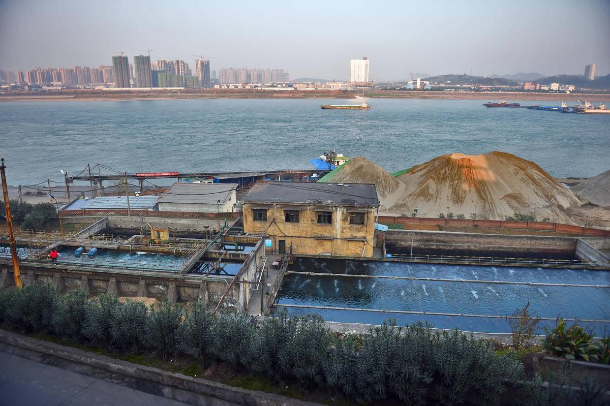 生态修复前 2016年12月,宜昌长江边的污水处理厂与砂石堆场林立。(湖北日报全媒记者 刘曙松 摄)