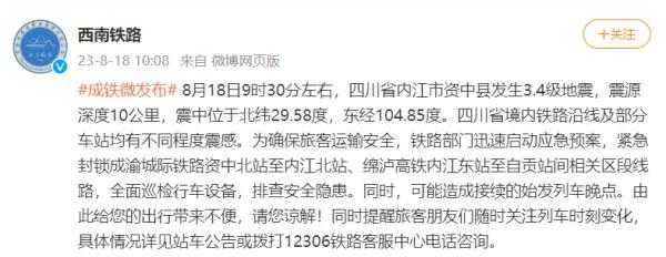 8月18日10时08分,西南铁路官方微博发布消息,称受地震影响,四川省境内铁路沿线及部分车站均有不同程度震感。