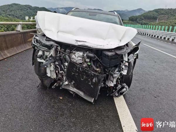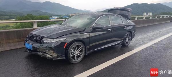 2023年8月6日14时许,在G98环岛高速公路某路段,当事人驾驶着一辆号牌为琼DV****的黑色汽车行驶时,因雨天路滑,加上当事人操作不当,碰撞上旁边的护栏,导致该车辆车头损坏。