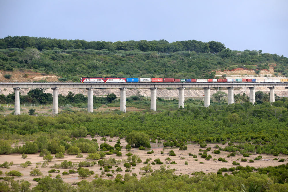 2022年7月27日,在肯尼亚蒙巴萨红树林旁,一列货运列车行驶在蒙内铁路线上。新华社记者董江辉摄
