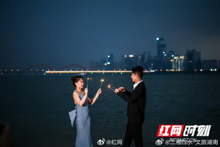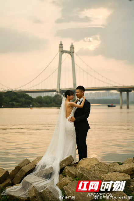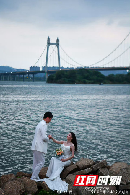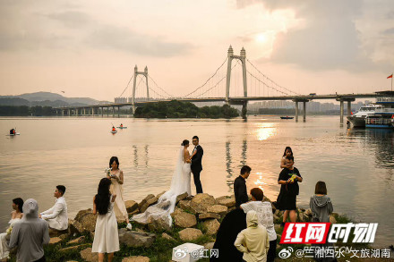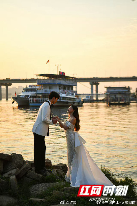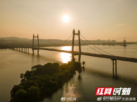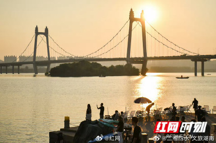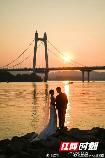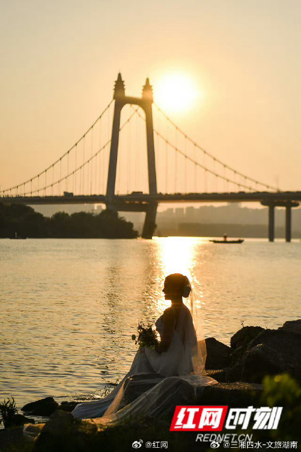 黄昏时分,长沙三汊矶大桥湘江与捞刀河交汇处,宽广的江面,被夕阳渲染成一片橘黄色的海洋。落日、晚风、粼粼波光、盛装的情侣,绘成一幅绝美的夏日风情画,让人流连忘返。