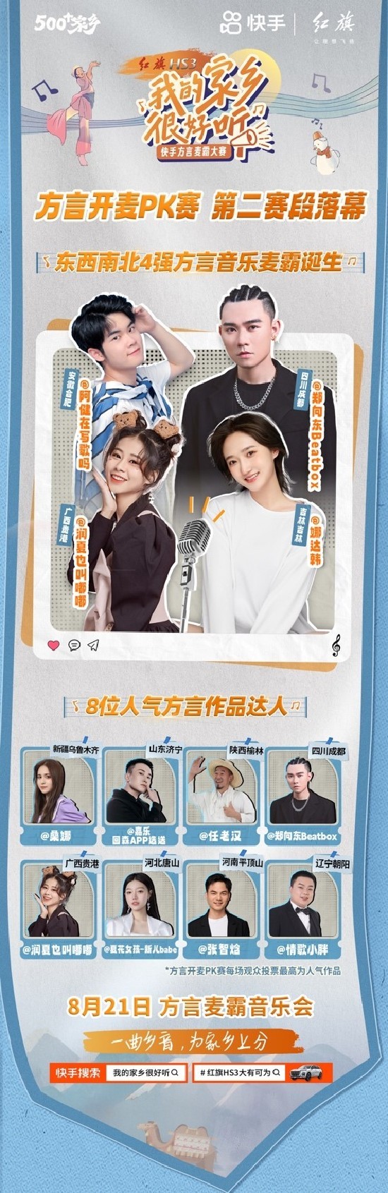 据了解,此次快手方言麦霸大赛由红旗HS3独家冠名,邀请宝石Gem、锤娜丽莎、宋木子、张尕怂分别担任北部、东部、南部、西部的发起人,以3个话题挑战赛+4场直播PK竞演+1场线下音乐会,带领方言音乐达人用一曲乡音,为家乡上分。