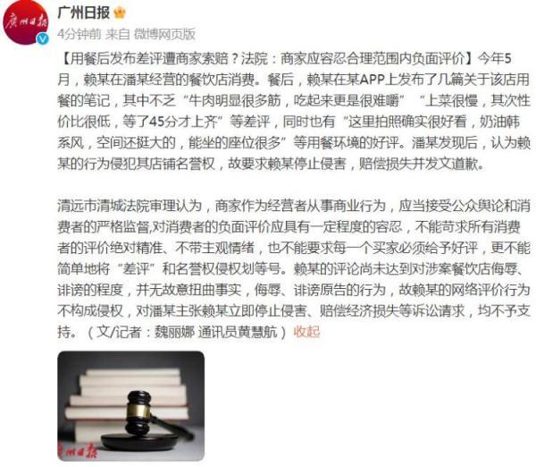 清远市清城法院审理认为,商家作为经营者从事商业行为,应当接受公众舆论和消费者的严格监督,对消费者的负面评价应具有一定程度的容忍,不能苛求所有消费者的评价绝对精准、不带主观情绪,也不能要求每一个买家必须给予好评,更不能简单地将“差评”和名誉权侵权划等号。赖某的评论尚未达到对涉案餐饮店侮辱、诽谤的程度,并无故意扭曲事实,侮辱、诽谤原告的行为,故赖某的网络评价行为不构成侵权,对潘某主张赖某立即停止侵害、赔偿经济损失等诉讼请求,均不予支持。(文/记者:魏丽娜通讯员黄慧航)