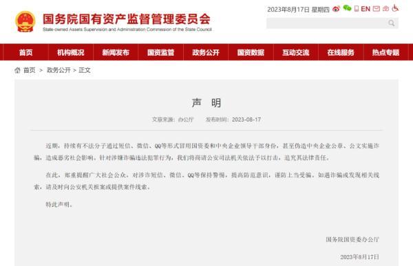 近期,持续有不法分子通过短信、微信、QQ等形式冒用国资委和中央企业领导干部身份,甚至伪造中央企业公章、公文实施诈骗,造成恶劣社会影响。针对涉嫌诈骗违法犯罪行为,我们将商请公安司法机关依法予以打击,追究其法律责任。