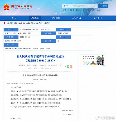 8月18日,据贵州省人民政府网站消息,省人民政府同意:推荐王莉为中国贵州茅台酒厂(集团)有限责任公司董事、副董事长、总经理人选;推荐涂华彬、王晓维为中国贵州茅台酒厂(集团)有限责任公司副总经理人选。建议李静仁不再担任中国贵州茅台酒厂(集团)有限责任公司副董事长、董事、总经理职务;建议高山不再担任中国贵州茅台酒厂(集团)有限责任公司副总经理职务。以上人员职务调整按照《中华人民共和国公司法》和有关规定程序办理。