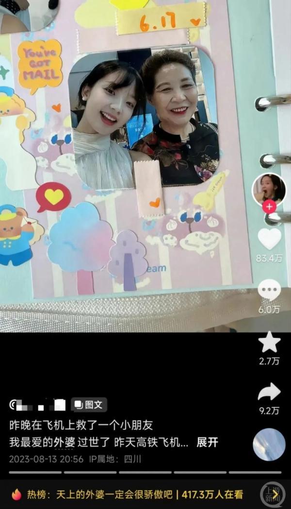 8月13日晚,一名网友在某短视频平台发布视频称,12日晚她回成都参加外婆葬礼途中,在飞机上救了一个“呼吸性碱中毒”的小朋友。视频发布后,引起网友们的广泛关注。