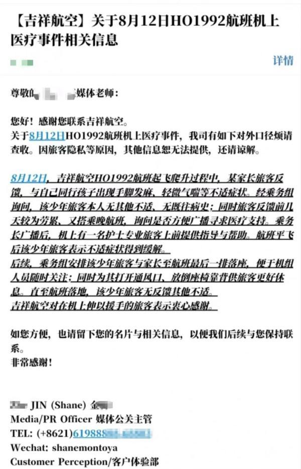 吉祥航空通过邮件证实机上救人一事并感谢唐女士的帮助。