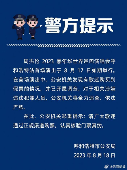 据“平安青城”微信公众号消息,周杰伦2023嘉年华世界巡回演唱会呼和浩特站首场演出于8月17日如期举行。在首场演出中,公安机关发现有歌迷购买到假票的情况,并已开展调查。对于相关涉嫌违法犯罪人员,公安机关将全力追查、依法严惩。在此,公安机关郑重提示:请广大歌迷通过正规渠道购票,认真核验门票真伪。