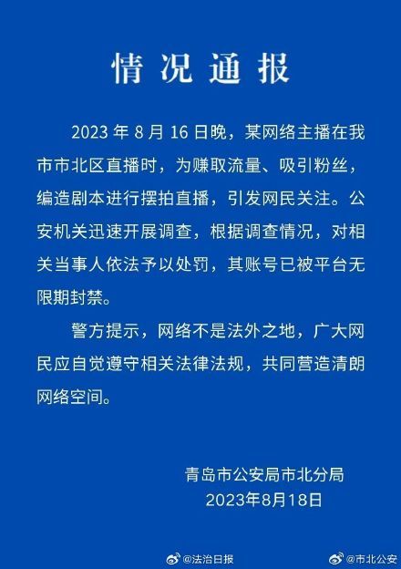 8月18日下午,山东省青岛市公安局市北分局官方微博“市北公安”发布《情况通报》,原文如下: