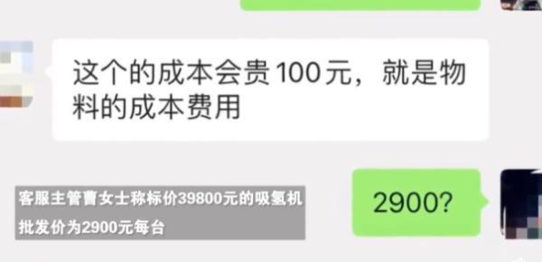 记者假装买家,与吸氢机的厂家联系,厂家说官网售价39800元一台的吸氢机,若用于开店批量购买,价格为2900元每台,还强调“你们出售时价格最好不要定得太低”。