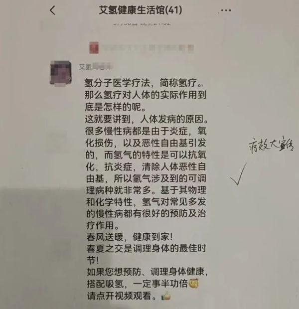 该门店组建了一个数十人的微信群聊,群内成员多是些老人。该门店人员经常在群内发送“氢气、氢水能治疗疾病”的相关链接。该门店人员还在群内称:“最近看到不少坚持按我要求使用的会员报来喜讯,说眼睛好多了,降压药、降糖药、胰岛素减量了。”“氢气的特性就是抗氧化、抗炎症,清除人体恶性自由基,所以氢气涉及的可调理病种非常多,氢气对常见多发的慢性病都有很好的预防及治疗作用。