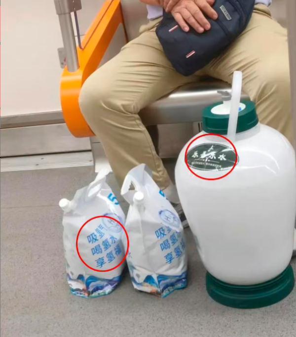 口袋上写着“吸氢气,喝氢水,享氢福”。