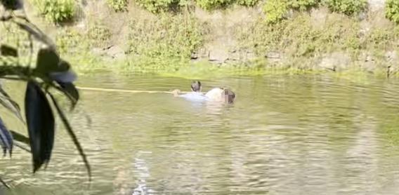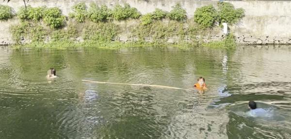 用救生杆托举着在水里挣扎的女孩