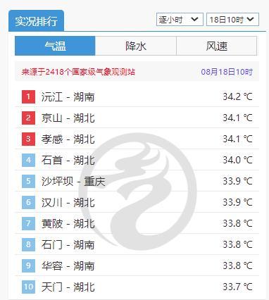 今日,中央气象台实况信息显示,8月18日10时气温实况排行榜上,前十有九个位于湖南、湖北两省,其中沅江市气温排名第一。省气象台预计,我省高温将持续至下周初,请公众做好防暑降温。