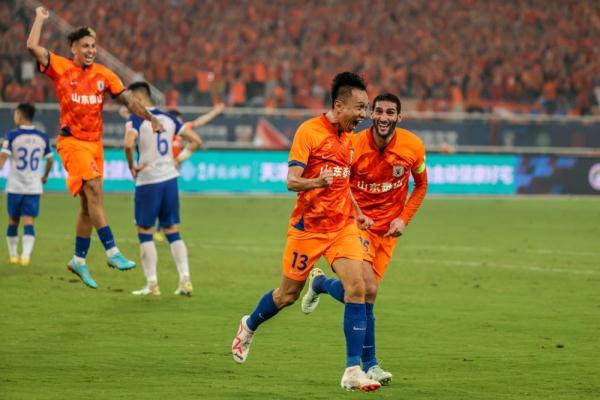 8月18日,山东泰山队球员张弛(前)在比赛中庆祝进球。新华社记者 朱峥 摄