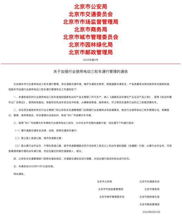 2024年1月1日起,违规电动三、四轮车在北京全市范围内将禁止上路,同时,也将禁止在公共场所内停放。但一些民生服务行业确实存在使用电动三轮摩托车的需求,8月18日,北京发布《关于加强行业使用电动三轮车通行管理的通告》,将针对从事邮政寄递、园林绿化、环卫等民生服务行业的电动三轮载货摩托车,符合管理办法规定的,核发“京C”号段摩托车号牌。