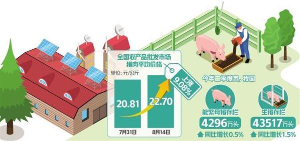 农业农村部监测数据显示,8月14日,全国农产品批发市场猪肉平均价格为22.70元/公斤,比7月31日的20.81元/公斤上涨9.08%。“近期,全国生猪价格开始触底,最近一段时间猪价快速反弹,生猪行情逐渐向好。”中国农业科学院北京畜牧兽医研究所研究员朱增勇对记者说。