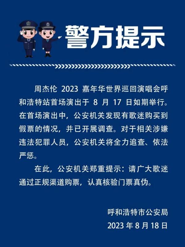 周杰伦2023嘉年华世界巡回演唱会呼和浩特站首场演出于8月17日如期举行。在首场演出中,公安机关发现有歌迷购买到假票的情况,并已开展调查。对于相关涉嫌违法犯罪人员,公安机关将全力追查、依法严惩。