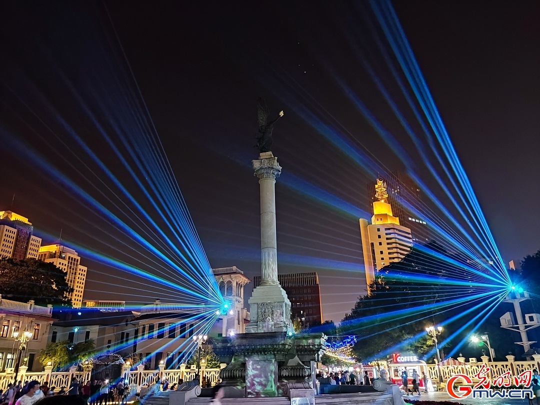 图为天津意式风情区马可波罗广场灯光秀展示。