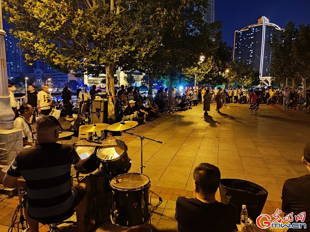 图为天津市民在海河沿岸开展自发性娱乐活动。