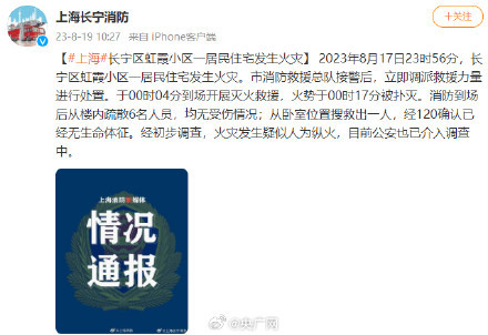 2023年8月17日23时56分,长宁区虹霞小区一居民住宅发生火灾。市消防救援总队接警后,立即调派救援力量进行处置。于00时04分到场开展灭火救援,火势于00时17分被扑灭。消防到场后从楼内疏散6名人员,均无受伤情况;从卧室位置搜救出一人,经120确认已经无生命体征。经初步调查,火灾发生疑似人为纵火,目前公安也已介入调查中。(上海长宁消防)