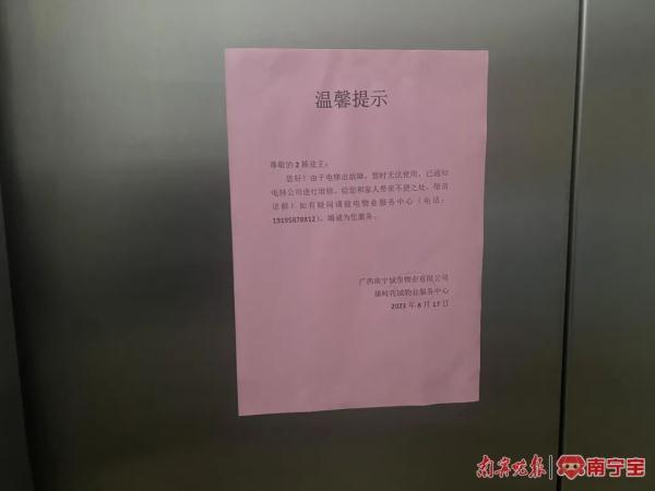 近日,南宁市民周先生向南宁晚报报料热线5530111反映,自家小区同一楼栋内两台电梯同时停止运行,但是物业却不及时粘贴维修告示,质疑物业存在不作为的情况。