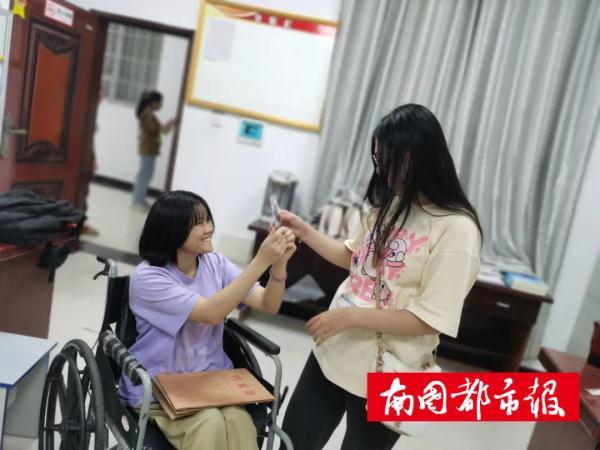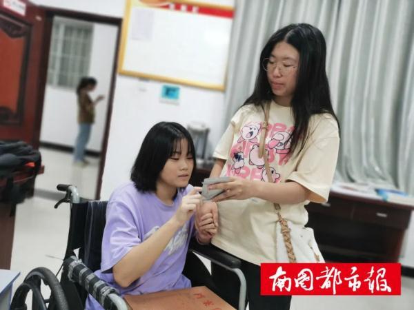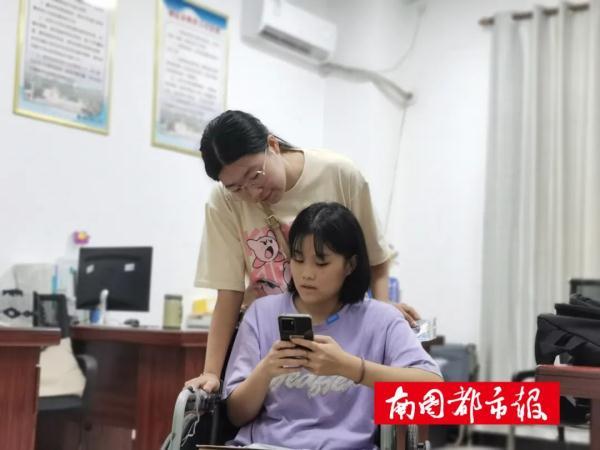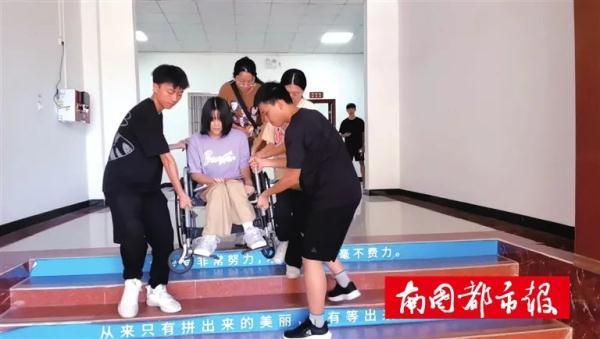 “同学们,麻烦让一下……”早上7时许,一个高大的男生背着王以希从一楼上到三楼,后面有几名女生帮忙拿书包。下午放学,志愿者们又抬着她从三楼下到一楼。然后,同宿舍的女生再推她回去。2020年9月1日开学之后,这样温情的画面每天都会在学校内上演。