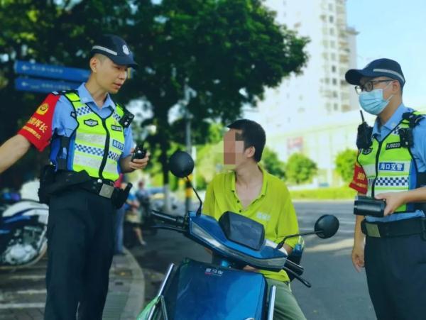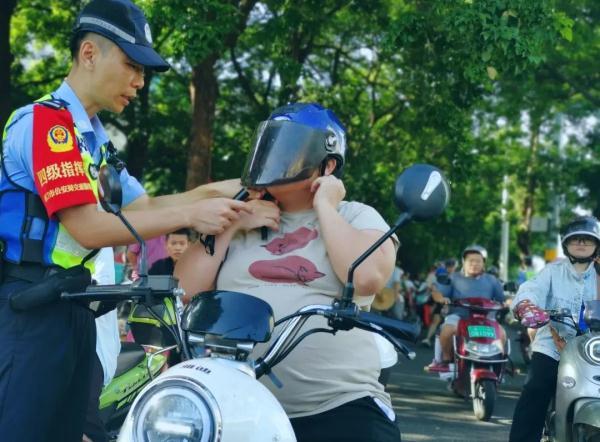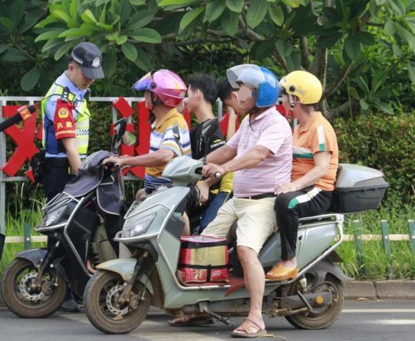 当天上午,记者在海口市多条路段看到,交警、派出所、城管人员、志愿者等在路面联合开展交通安全守护行动,对过往不佩戴安全头盔的驾乘人员进行查纠、劝导。