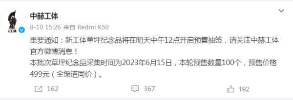 8月11日,第一轮预售在微博开启,转发开售“草坪纪念品”的微博就可视作参与抽签,中签后就可付费购买。首批“草坪纪念品”数量100个,售价499元。