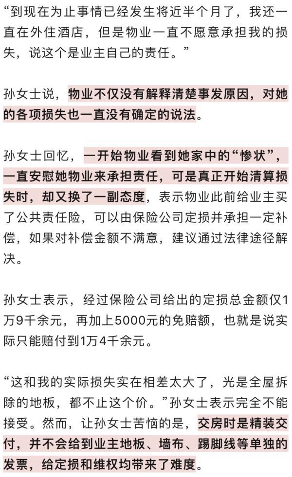 孙女士称,对于保险无法覆盖的损失,她也曾和物业协商,希望物业能承担一部分责任:“物业一开始答应,可以承担木地板的费用,可是后来又说不能承担了;8月8日他们说,让我保留在外住酒店的单据,物业会想办法协调沟通,可是过了几天,又不认账了,说无法报销;直到8月16日,物业也只松口说可以承担5000元免赔额部分。”