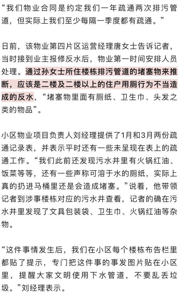 “反水的管道是公共排污管道,当时从主管道里抽出了很多的卫生纸。”孙女士认为,污水管中有卫生纸非常正常,但作为房龄较新的房屋,因为卫生纸就有如此程度的反水,让她不能接受。“小区业主们也一起讨论过,说家里常常会有马桶反出来的异味,我很担心会不会是管道的硬件问题或者是物业的维护、排污不到位,才造成这样的结果,以后我不在家的时候,是否还会无数次发生同样的问题?”