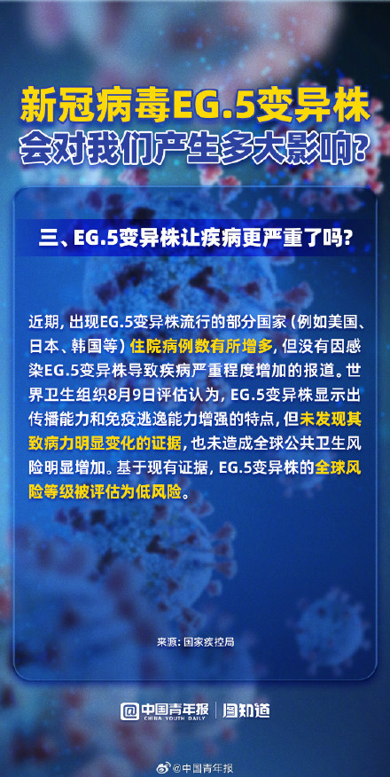 目前,新冠病毒EG.5变异株已在我国绝大多数省份形成优势流行。EG.5变异株是什么?会导致病情更加严重吗?如何做好个人防护?关于EG.5变异株,今日国家疾控局发布科普文章,共同了解,科学防护。