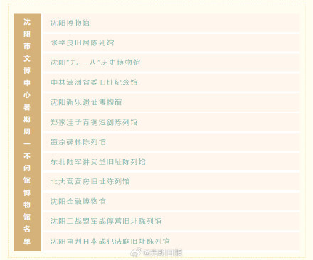 即日起至8月31日,辽宁省沈阳市文博中心12家博物馆取消周一闭馆政策,并将根据客流、观众需求、展览内容等,及时调整预约制度,积极营造良好有序的参观环境,提高观众参观体验,让市民游客在暑期每天都有博物馆可以参观。戳图,看看这12家周一不闭馆的博物馆,你最想去哪一家?(光明日报全媒体记者刘勇)