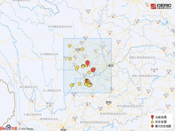 根据中国地震台网速报目录,震中周边200公里内近5年来发生3级以上地震共307次,最大地震分别是2021年9月16日在四川泸州市泸县发生的6.0级地震(距离本次震中62公里)和2019年6月17日在四川宜宾市长宁县发生的6.0级地震(距离本次震中138公里),按震级大小前50次历史地震分布如图。