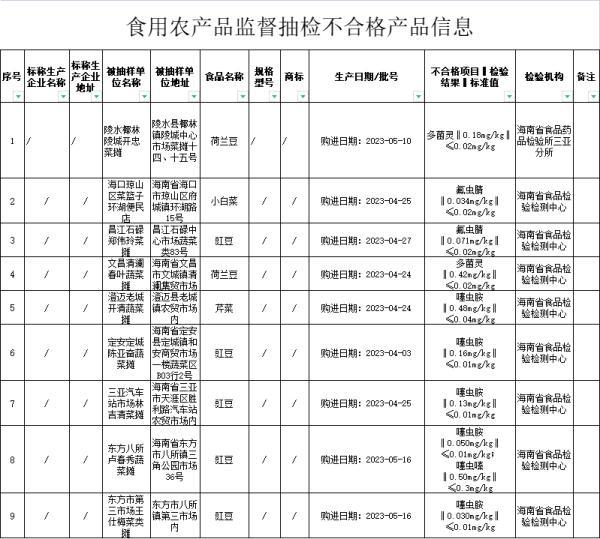 海南省市场监督管理局表示,对上述抽检中发现的不合格食品,当地市场监管部门已经采取措施依法予以查处,责令食品生产企业查清产品流向、召回不合格产品、分析原因进行整改;责令食品经营环节有关单位立即采取下架等措施防控风险。并责令食用农产品集中交易市场开办者查清进货渠道、产地等信息并向相关部门报告;责令食用农产品销售者对不合格产品立即采取停止销售等措施防控风险。