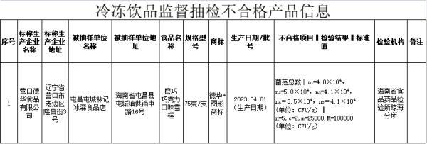 十四、屯昌屯城林记冰森食品店(地址:屯昌县屯城镇供销中路16号)销售的标称营口德华食品有限公司(地址:辽宁省营口市老边区隆昌街3号)生产的磨巧巧克力口味雪糕(生产日期:2023-04-01,规格型号:75克/支),检验项目菌落总数不符合食品安全国家标准规定。