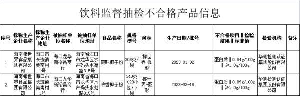 十二、海口龙华新裕昌商行(地址:海口市龙华区水产码头水港路315号)销售的标称海南椰世界食品集团有限公司(地址:海口市长流镇美南村1号)生产的原味椰子粉(规格:306克/袋,生产日期:2023-01-02),检验项目蛋白质不符合食品安全国家标准规定。