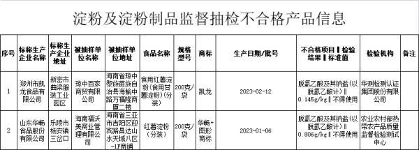 二、海南福沃美商业管理有限公司(地址:三亚市吉阳区迎宾路昌达山水天域八区-1F商铺)销售的标称山东华畅食品股份有限公司(地址:山东省德州市乐陵市杨安镇三岔口)生产的红薯淀粉(分装)(生产日期:2023-01-06,规格型号:200克/袋),检验项目脱氢乙酸及其钠盐(以脱氢乙酸计)不符合食品安全国家标准规定。