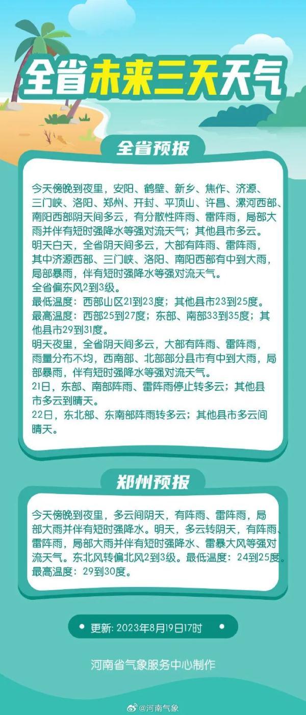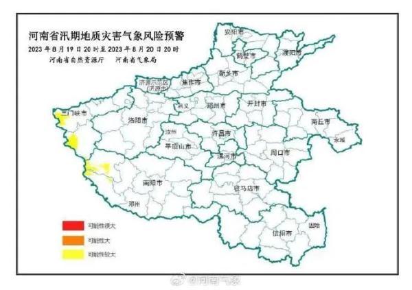 河南省自然资源厅、河南省气象局联合发布地质灾害气象风险预警:2023年08月19日20时至20日20时,河南省地质灾害气象风险预警达到黄色预警的地区为:三门峡、南阳西部局部,发生地质灾害的可能性较大。