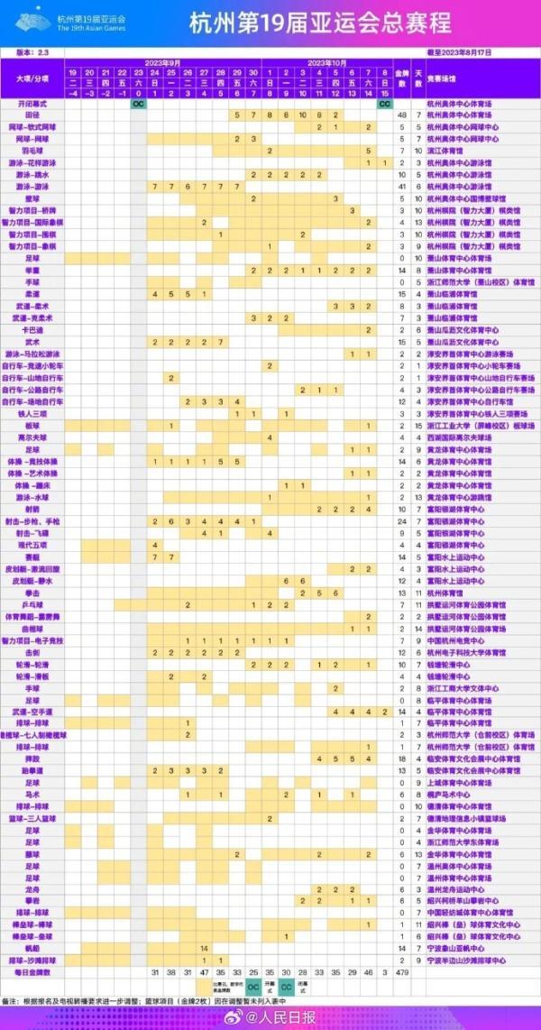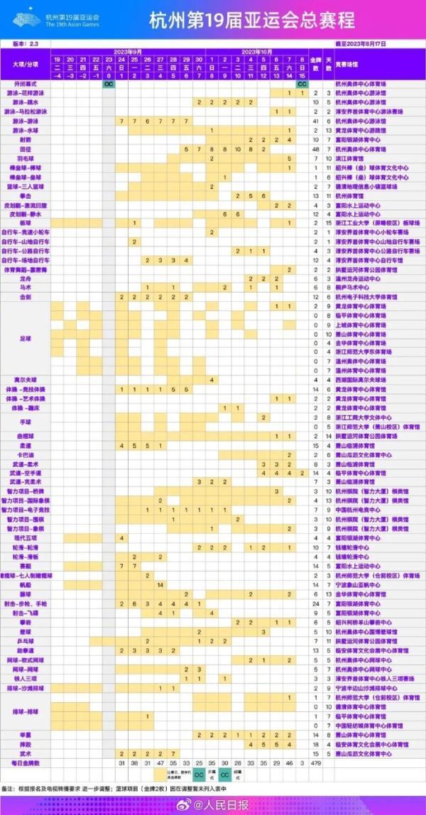 今天,@杭州第19届亚运会发布杭州亚运会最新版总赛程。经各项目技术代表确认,杭州亚运会总赛程动态调整至2.3版。与总赛程2.2版相比,更新调整涉及足球、排球、轮滑、羽毛球、拳击等项目。