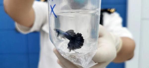 近日,南宁海关所属东兴海关查验人员在对一名从东兴口岸“无申报通道”入境的旅客进行行李检查时,在行李箱中查获39个用橡皮筋扎口的透明塑料水袋,每个水袋中均有一条色彩斑斓的活体小鱼。经鉴定,39条小鱼均为孔雀花鳉,多做观赏鱼,为外来物种,目前已按相关规定作进一步处理。