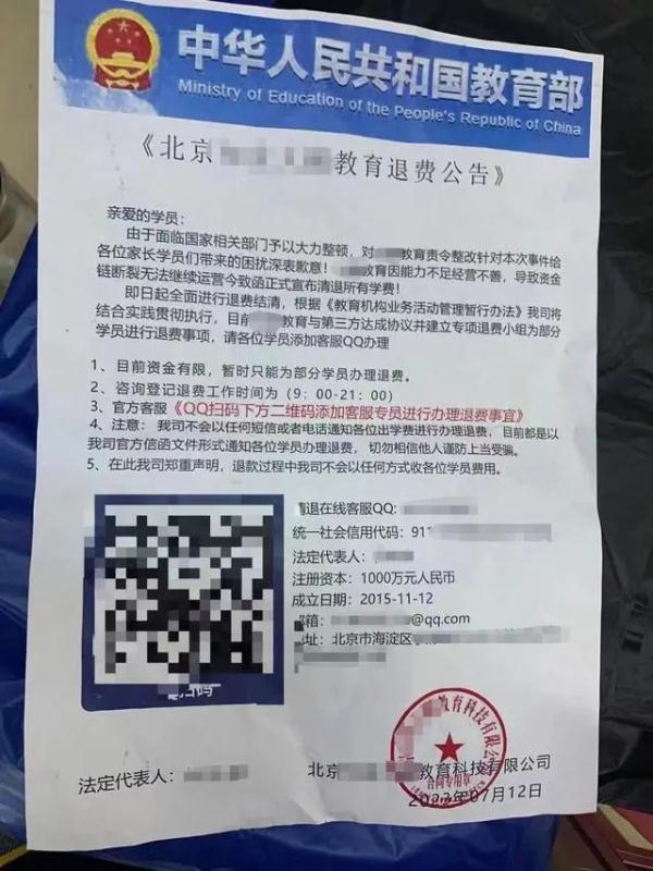 1、筛选人群:骗子通过非法渠道获取培训机构学员信息,伪造“退费公告”寄递给受害人,要求受害人添加“客服”QQ或微信办理“培训退费”。