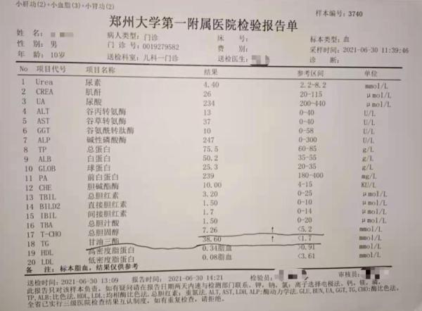 我和孩子的父亲一直在外打工,收入并不高,家里老人和小孩又都生病着。我还有一个小儿子,他今年才11岁,不知道得了什么病,身体的甘油三酯比正常值高许多。我带他去了很多地方看病,做了无数的检查,都没有查出来是什么病,也希望有好心人能帮我们出出主意。