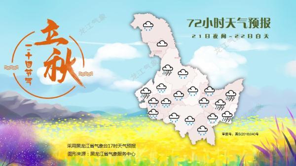 21日:黑河东部、伊春西部、齐齐哈尔东部、大庆、绥化、哈尔滨北部和东部有大雨,其中齐齐哈尔东北部、大庆、绥化局地暴雨,其它大部地区小到中雨。中西部地区伴有短时强降水、雷雨大风、冰雹等强对流天气。最大小时雨量20~40毫米。