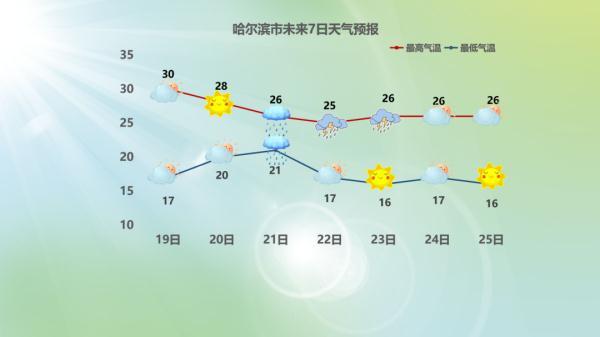 20日白天:哈尔滨市晴间多云,西南风1~3 级,最低气温15~18℃,最高气温28~30℃。