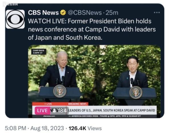 美国哥伦比亚广播公司新闻频道在报道时错误地将拜登的头衔标为美国前总统。网友在社交媒体平台上发现了这个错误。
