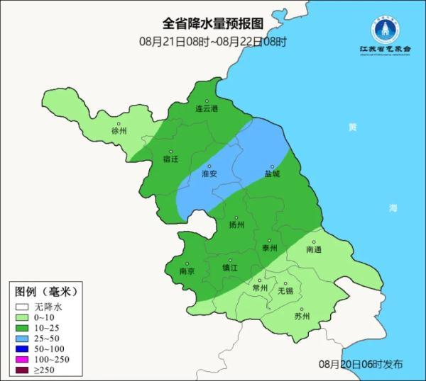 8月21日08时至8月22日08时:全省多云到阴,大部分地区有分散性阵雨或雷雨,其中淮北和江淮之间地区雨量中等局部大雨。最高温度全省32~33℃;最低温度沿江和苏南地区25~26℃,其他地区24℃左右。全省偏南风转偏西风,风力都是4级左右。