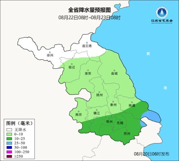 8月22日08时至8月23日08时:沿淮及其以南地区有分散性阵雨或雷雨,其中苏南地区雨量中等,局部大雨。最高温度本省西北部地区34℃左右,本省东南部地区31℃左右。其他地区28~29℃;最低温度全省23~24℃。全省偏西风转偏北风,风力都是4级左右。